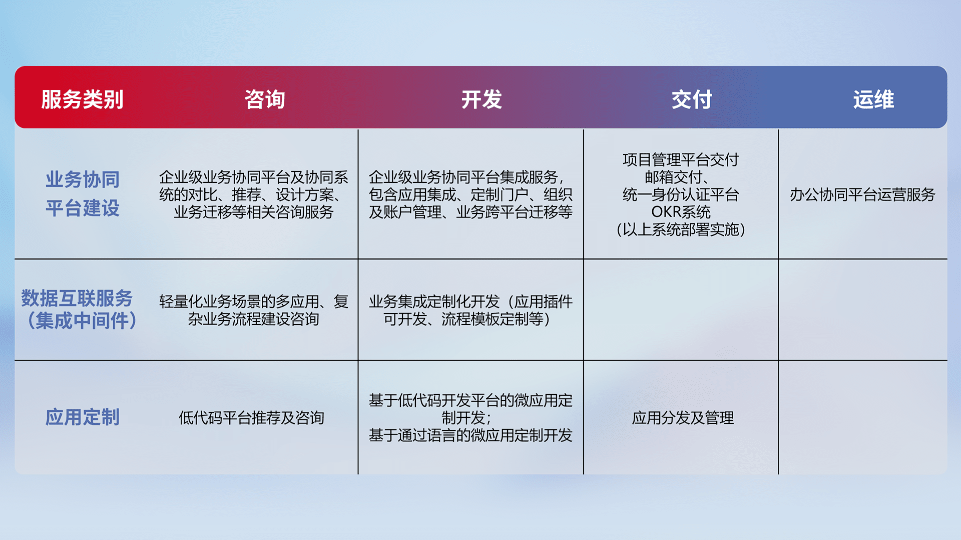 针对钉钉、、、企微、、、、IDaas等平台级产品提供产品的规划、、方案、、、交付、、、、定制化开发等服务,,实现如统一协同办公、、、、智能客户服务、、、、混合会议管理、、、智能数据查询、、等业务场景,,,,实现数字化转型。。