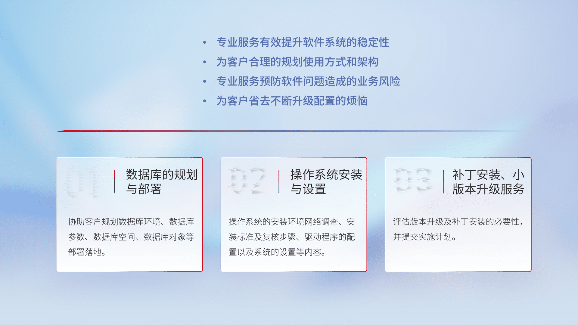 为客户提供软件规模升级、、、、快速部署、、按需配置的专业服务,,,,从数据库的规划与部署到操作系统的安装与设置,,,,再到补丁安装和小版本升级提供支持。。。。