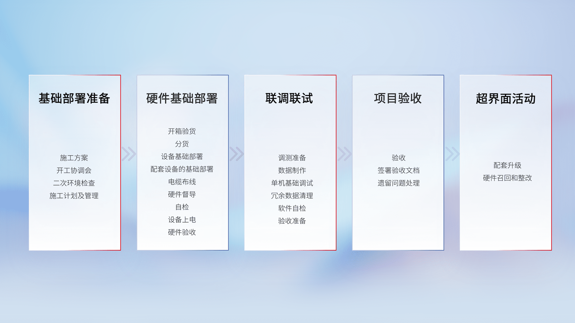 从基础部署准备、、硬件基础部署、、、、联调联试、、项目验收、、越界面活动的全过程可追溯,,保证施工质量和进度。。。